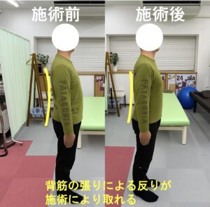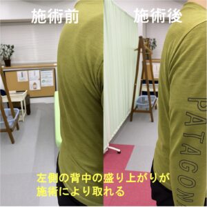 施術前は背中全体が反ったように張り、特に左側の背筋が右より盛り上がっている状態(画像参照)。