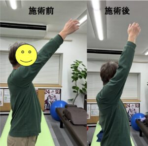 写真の通り、施術前に比べてしっかりと腕が挙がるようになり、